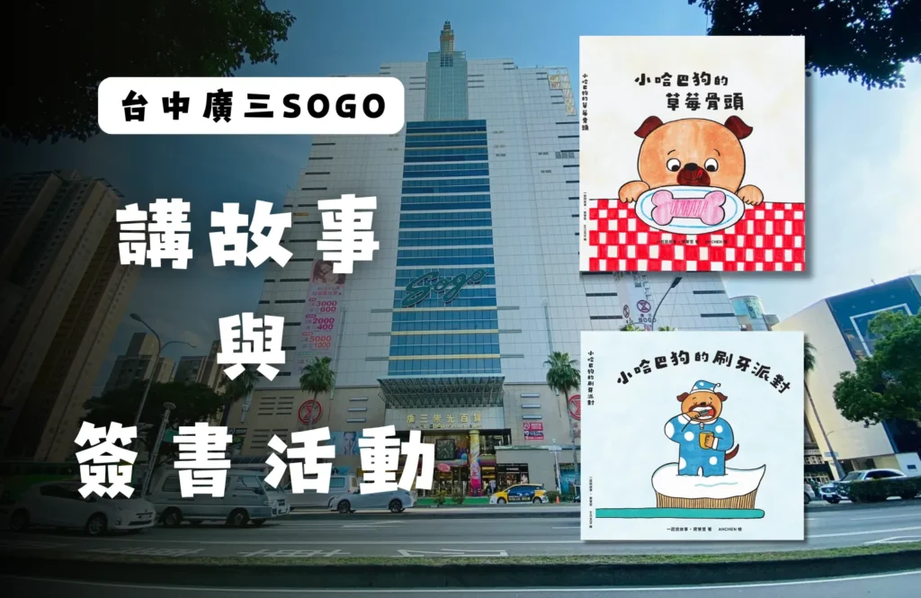 **【一起說故事】繪本:《 小哈巴狗的挖土機》、《小哈巴狗的草莓骨頭》、《小哈巴狗的刷牙派對》、《尋找小綿羊》。如需購書,紀伊國屋書店位於百貨12F。